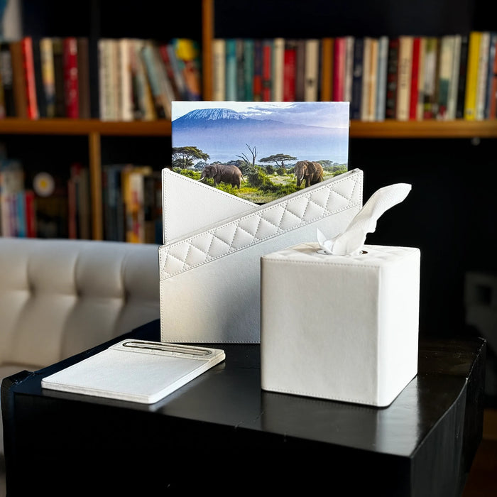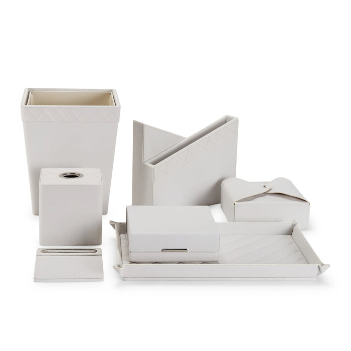 Inspired by the elegance of luxury car interiors, this 7-piece tufted white leather desk organizer set brings high-end design into your office space. Crafted from soft-touch fine grain vegan leather and featuring iconic diamond-pattern stitching, ... Read more